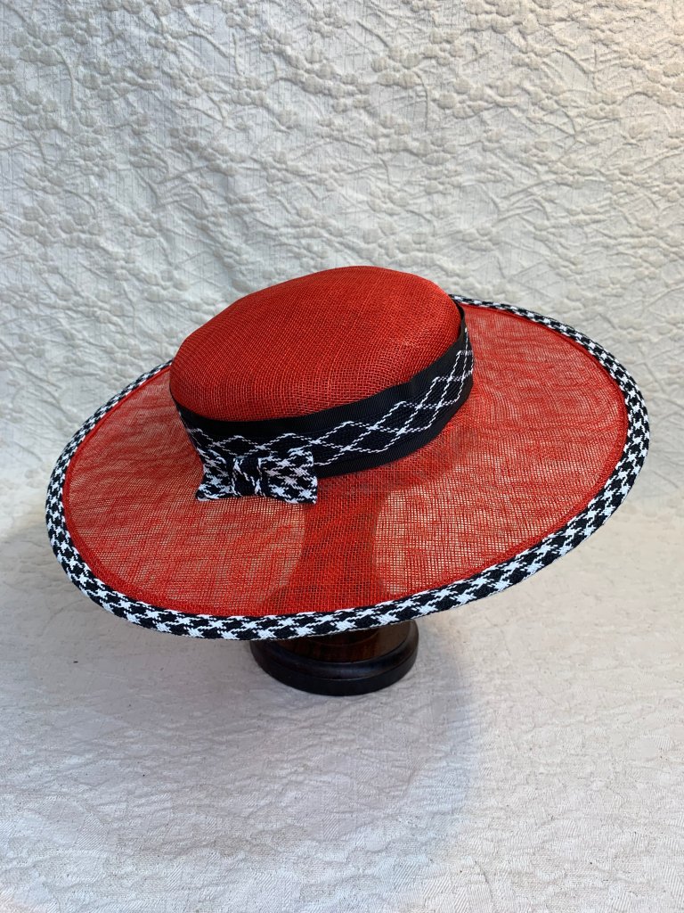 Red boater with black and white trim